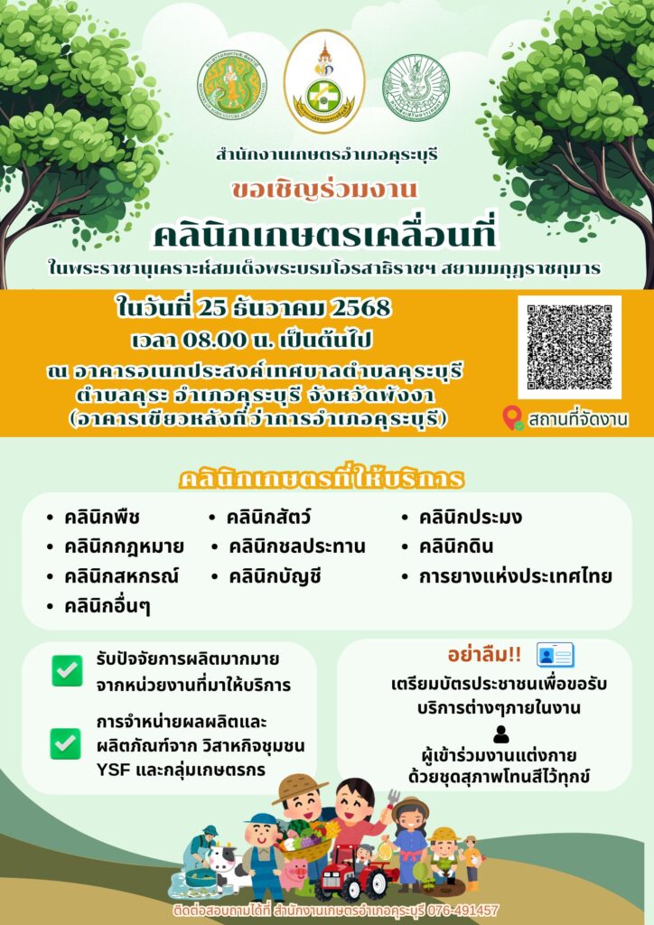 สำนักงานเกษตรจังหวัดพังงาและสำนักงานเกษตรอำเภอคุระบุรี ขอเชิญชวนเกษตรกร ร่วมงานคลินิกเกษตรเคลื่อนที่ในพระราชานุเคราะห์ฯ ในวันที่ 25 ธันวาคม 2568 ตั้งแต่ 08.00 น. เป็นต้นไป ณ อาคารอเนกประสงค์เทศบาลตำบลคุระบุรี ตำบลคุระ อำเภอคุระบุรี จังหวัดพังงา (อาคารเขียวหลังที่ว่าการอำเภอคุระบุรี)