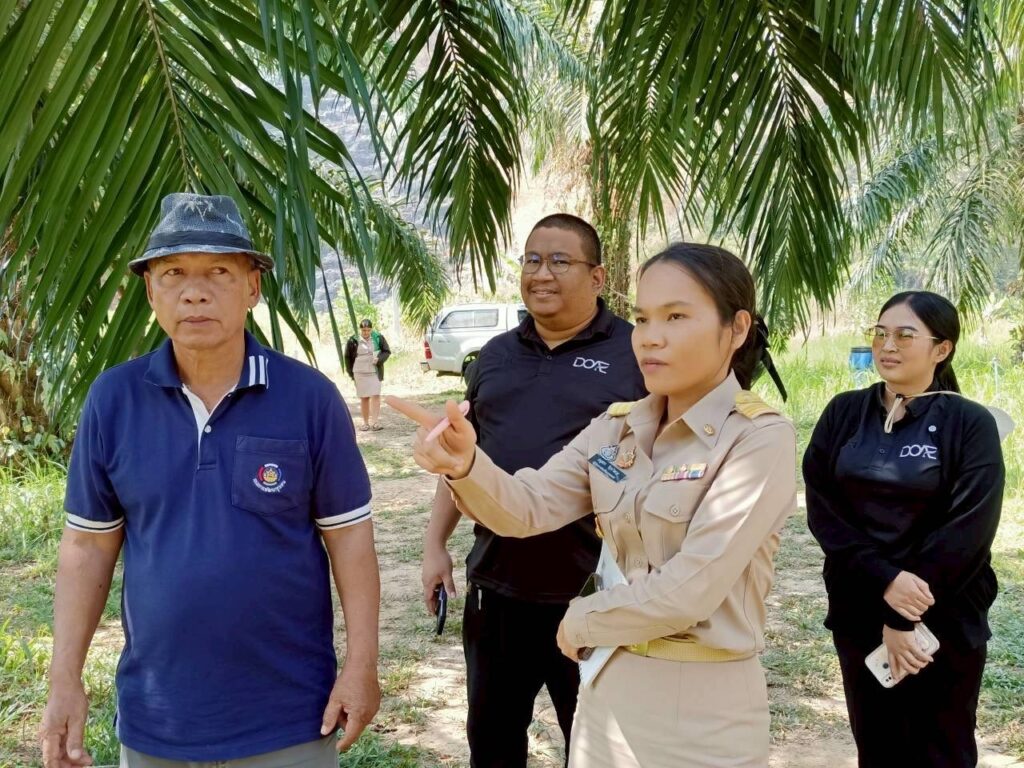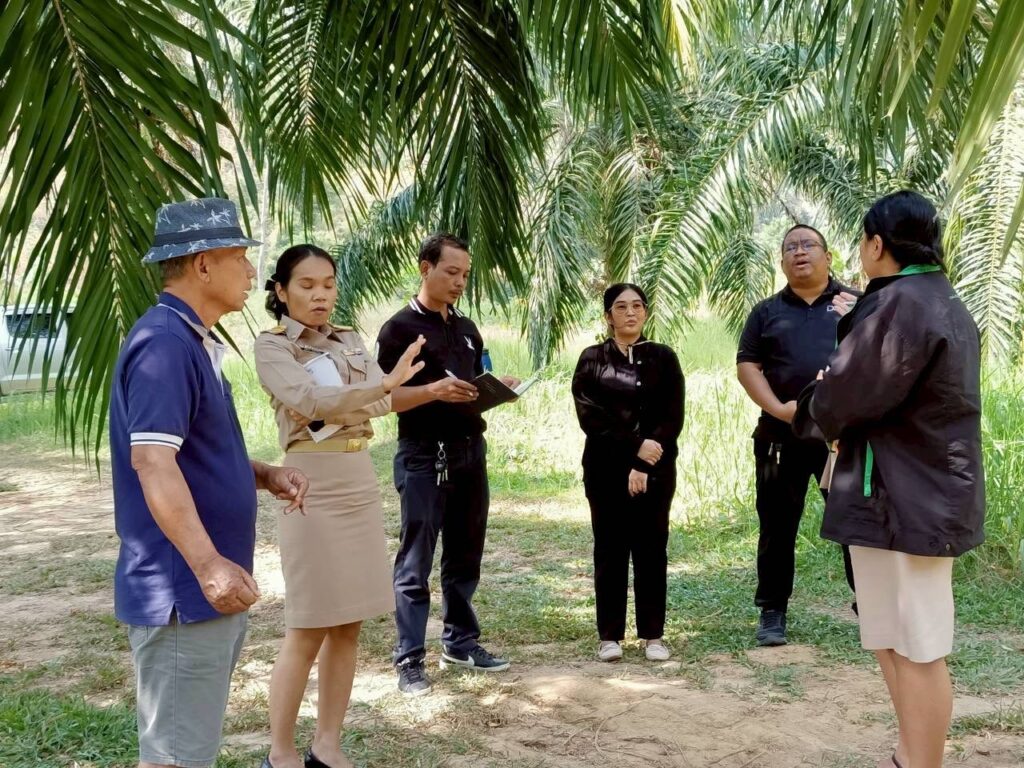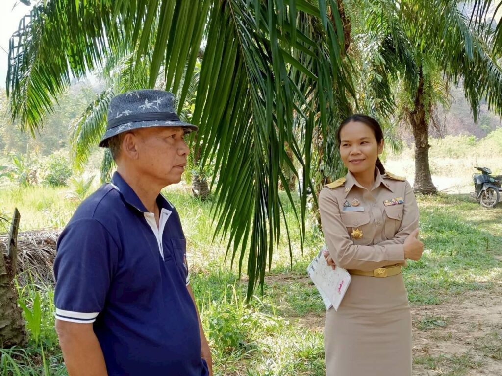 เมื่อวันที่ 12 มกราคม 2569 นางจรัสศรี คำภีรสิงห์ เกษตรจังหวัดพังงา มอบหมายให้ นางสาวอนุสรา จำปาดวง หัวหน้ากลุ่มอารักขาพืช พร้อมด้วยนางสาวสุภิญญา ทองพัฒน์ นักวิชาการส่งเสริมการเกษตรชำนาญการ กลุ่มอารักขาพืช สำนักงานเกษตรจังหวัดพังงา ลงพื้นที่ร่วมกับสำนักงานเกษตรอำเภอเมืองพังงา ติดตามสถานการณ์การระบาดของศัตรูพืชปาล์มน้ำมัน แปลงของเกษตรกร นายประทวน พลรบ ม.1 ต.บางเตย อ.เมืองพังงา จังหวัดพังงา พื้นที่เพาะปลูกปาล์มน้ำมัน 3 ไร่ อายุปาล์มน้ำมัน 7 ปี พบว่าได้รับความเสียหายจากโรคการ์โนเดอร์มา ซึ่งเป็นความเสียหายของต้นปาล์มน้ำมันประมาณ 0.5 ไร่