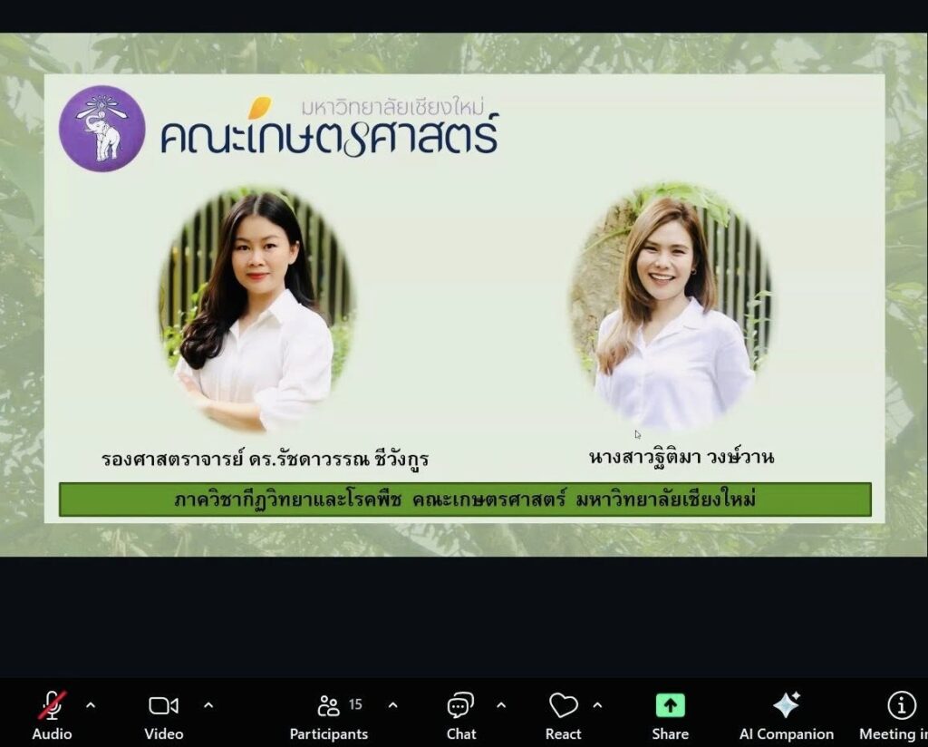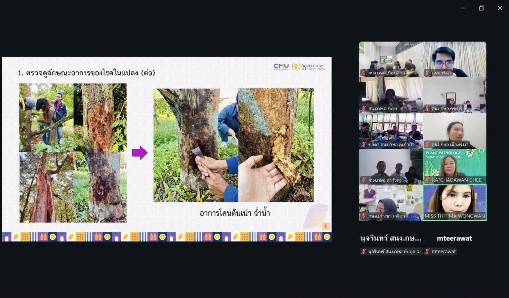 พร้อมกันนี้ได้รับเกียรติจาก รศ.ดร.รัชดาวรรณ ชีวังกูร อาจารย์ประจำภาควิชากีฏวิทยาและโรคพืช และนางสาวฐิติมา วงษ์วาน นักวิทยาศาสตร์เกษตร ภาควิชากีฏวิทยาและโรคพืช คณะเกษตรศาสตร์ มหาวิทยาลัยเชียงใหม่ ร่วมบรรยายพิเศษในหัวข้อเรื่อง โรคพืชที่สำคัญในทุเรียนและการป้องกันกำจัด และการวินิจฉัยโรคพืชเบื้องต้นรวมทั้งนวัตกรรมที่เกี่ยวข้อง เพื่อพัฒนาศักยภาพเจ้าหน้าที่และเกษตรกรของจังหวัดพังงาต่อไป