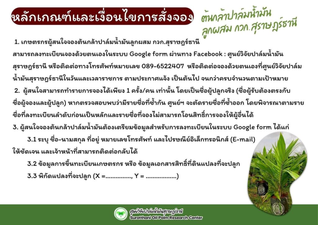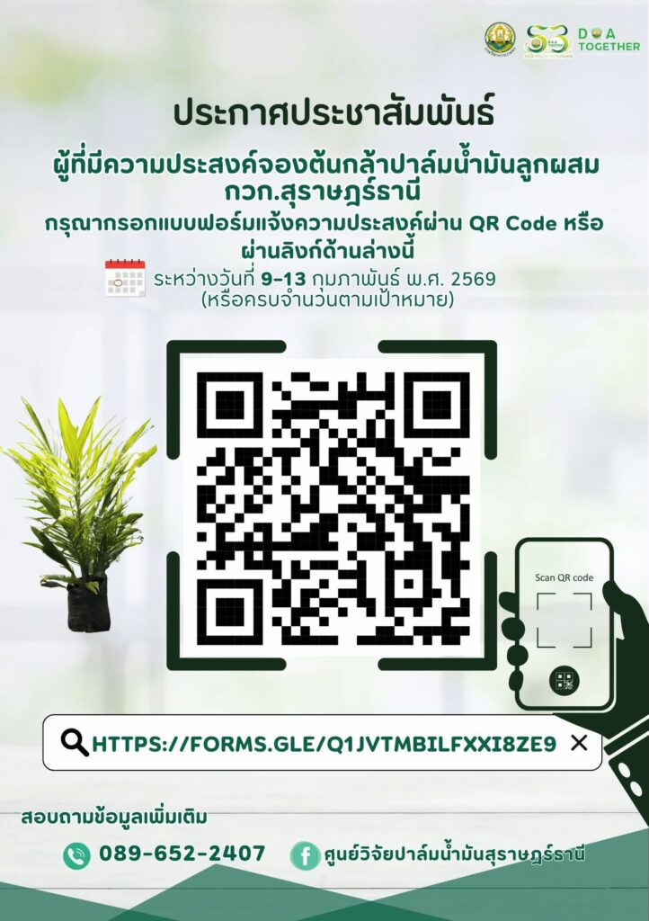 ศูนย์วิจัยปาล์มน้ำมันสุราษฏร์ธานี เปิดจองต้นกล้าปาล์มน้ำมัน กวก. สุราษฎร์ธานี ผ่านระบบ Google form ตั้งแต่วันที่ 9 ก.พ. 2569 เวลา 8.30 น.- 13 ก.พ. 2569 เวลา 16.30 น. หรือจนกว่าจะครบจำนวนตามเป้าหมาย ผู้สนใจสามารถลงทะเบียนจองตาม QR-code หรือ ลิงค์ตามแบบฟอร์มที่แนบมาด้านล่าง ระบบการจองจะเปิด วันที่ 9 ก.พ. 2569 เวลา 8.30 น.