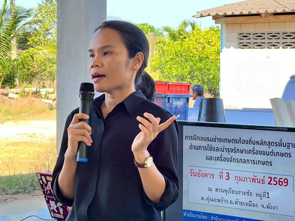 วันนี้ (3 ก.พ.69) นางจรัสศรี คำภีรสิงห์ เกษตรจังหวัดพังงา มอบหมายให้นางสาวอนุสรา จำปาดวง หัวหน้ากลุ่มอารักขาพืช พร้อมด้วยเจ้าหน้าที่กลุ่มอารักขาพืช สำนักงานเกษตรจังหวัดพังงา จัดฝึกอบรมโครงการส่งเสริมการใช้เครื่องจักรกลทางการเกษตร กิจกรรมส่งเสริมการใช้เครื่องจักรกลการเกษตรทดแทนแรงงานเกษตร ณ สวนทุเรียนรวยชัย หมู่ที่ 1 ตำบลทุ่งมะพร้าว อำเภอท้ายเหมือง จังหวัดพังงา