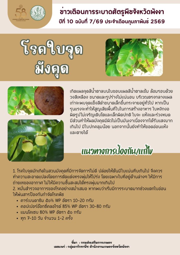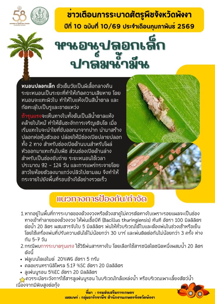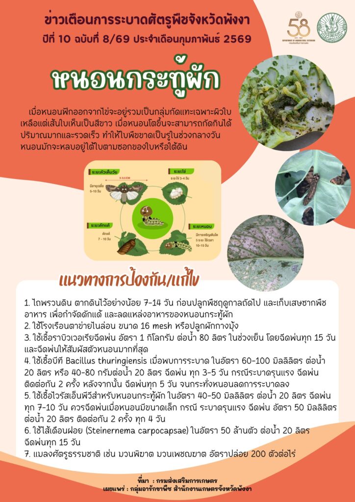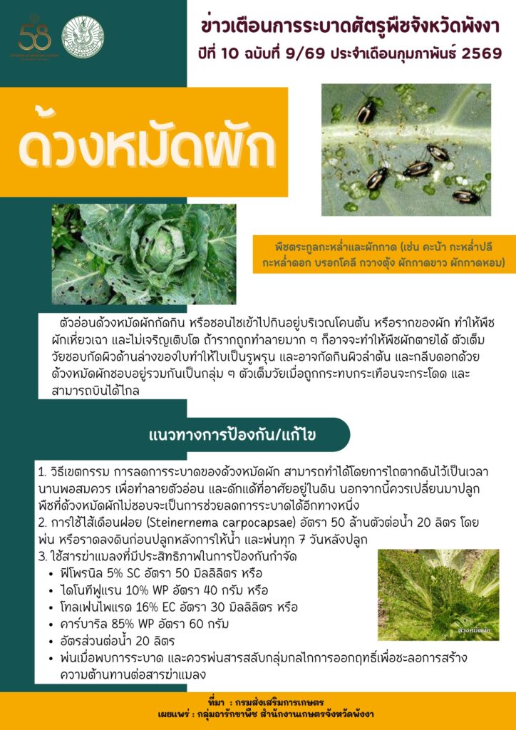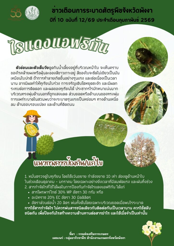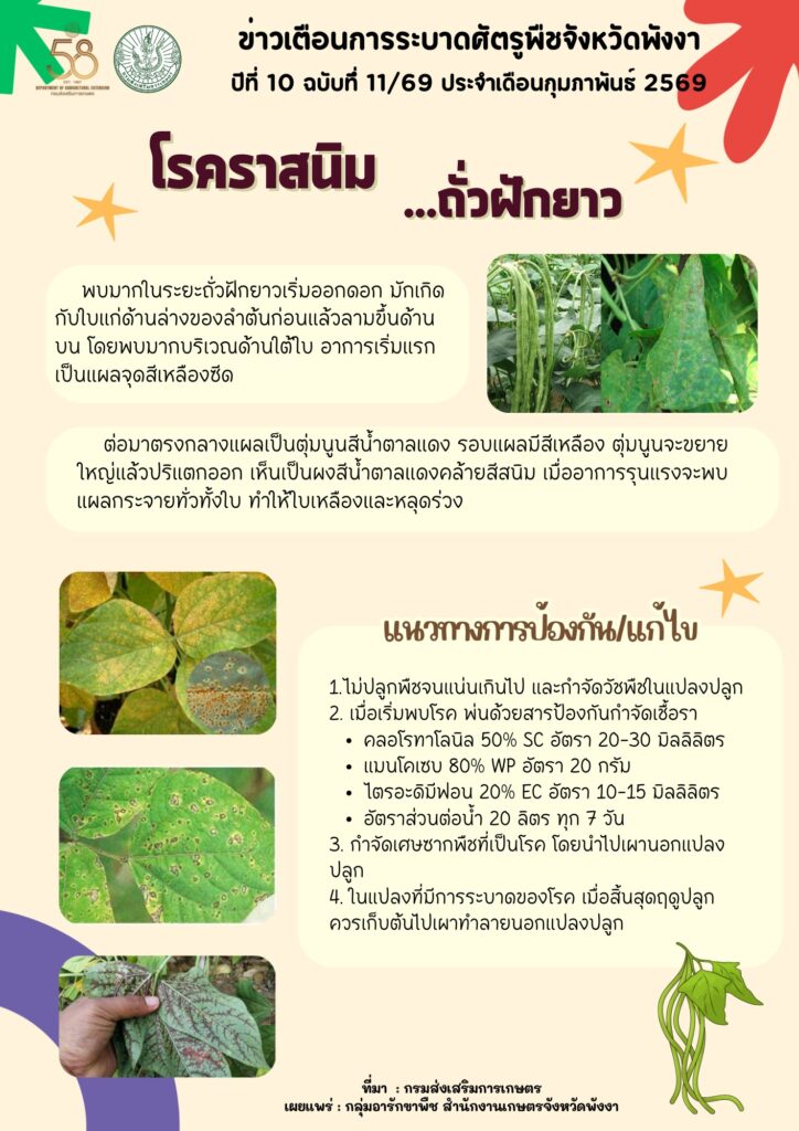 ข่าวเตือนการระบาดศัตรูพืชประจำเดือนกุมภาพันธ์ 2569By admin / 17 กุมภาพันธ์ 2026 โรคราสนิมถั่วฝักยาว หนอนกระทู้ผัก หนอนปลอกเล็กปาล์มน้ำมัน โรคใบจุดมังคุด ไรแดงแอฟริกัน ด้วงหมัดผัก
