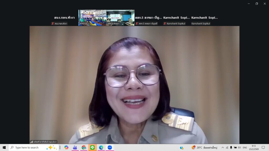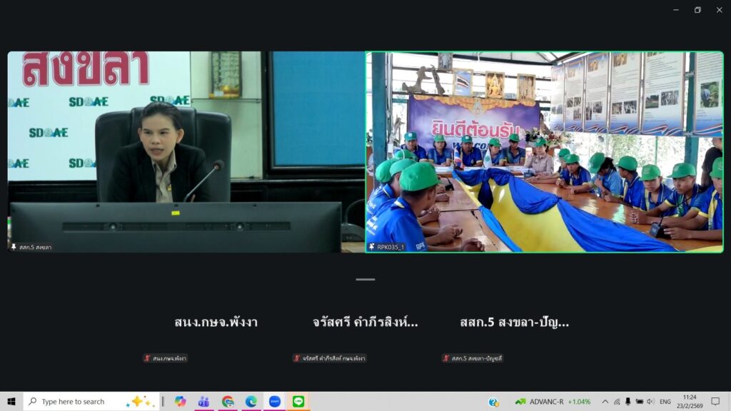 วันที่ 23 กุมภาพันธ์ 2569 ณ โรงเรียนราชประชานุเคราะห์ 35 จังหวัดพังงา สำนักงานเกษตรจังหวัดพังงา เข้ารับการคัดเลือกเกษตรกร บุคคลทางการเกษตร และสถาบันเกษตรกรดีเด่นระดับเขต ประจำปี 2569 ประเภทกลุ่มยุวเกษตรกรและที่ปรึกษากลุ่มยุวเกษตรกร ผ่านระบบออนไลน์ Zoom Cloud Meeting นางจรัสศรี คำภีรสิงห์ เกษตรจังหวัดพังงา ได้กล่าวพบปะคณะกรรมการและผู้เข้าร่วมการคัดเลือกฯ และนายจักรพงษ์ เอียดสกุล ผอ.โรงเรียนราชประชานุเคราะห์ 35 จังหวัดพังงา กล่าวต้อนรับคณะกรรมการและผู้เข้าร่วมการคัดเลือกฯ โดยมีคณะกรรมการจาก สำนักงานส่งเสริมและพัฒนาการเกษตรที่ 5 นำโดยนางอธิฐาน เรืองแก้ว นักวิชาการส่งเสริมการเกษตรชำนาญการ ปฏิบัติหน้าที่ผู้อำนวยการกลุ่มพัฒนาบุคลากร เป็นประธานคณะกรรมการพิจารณาคัดเลือก