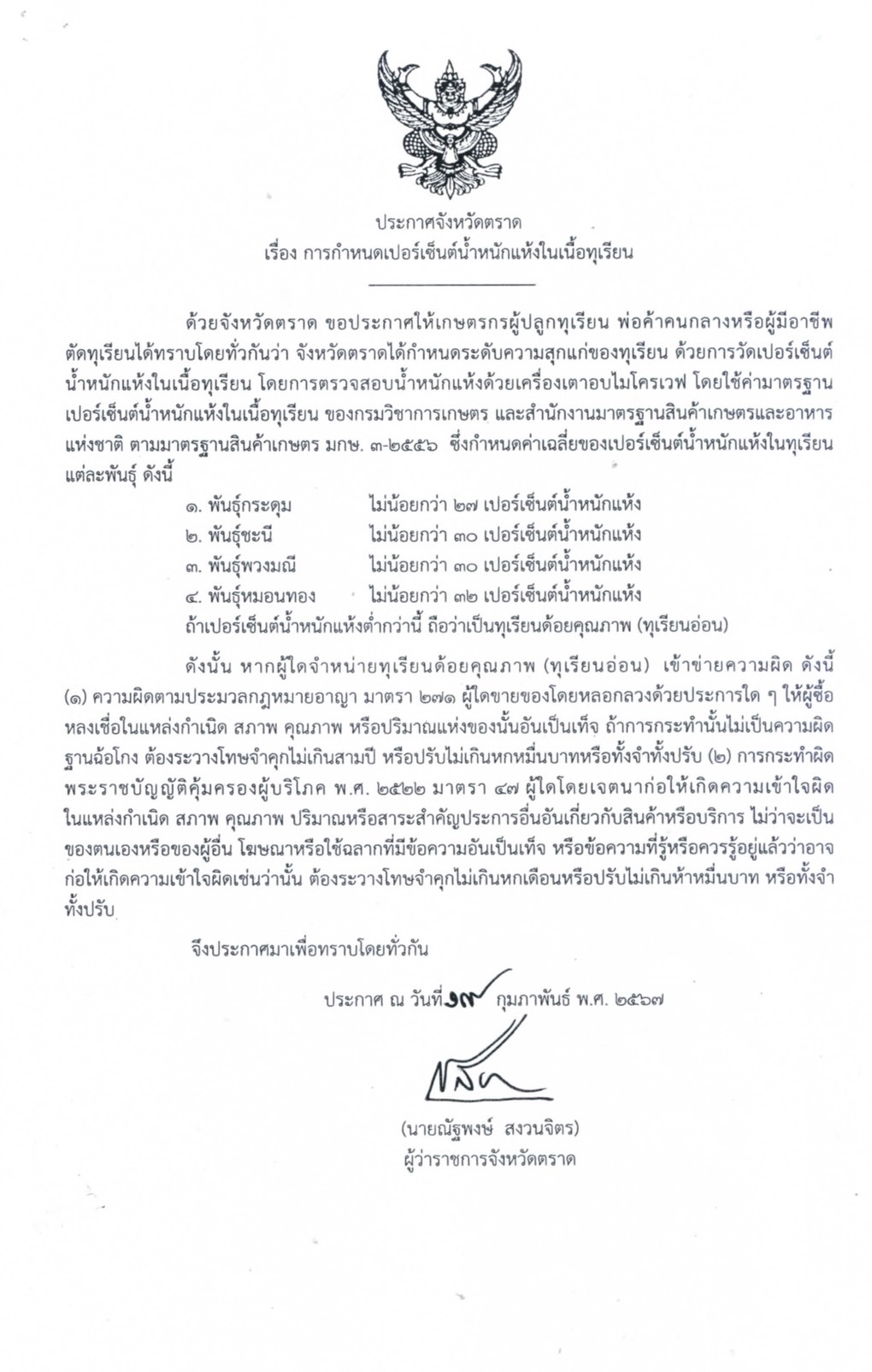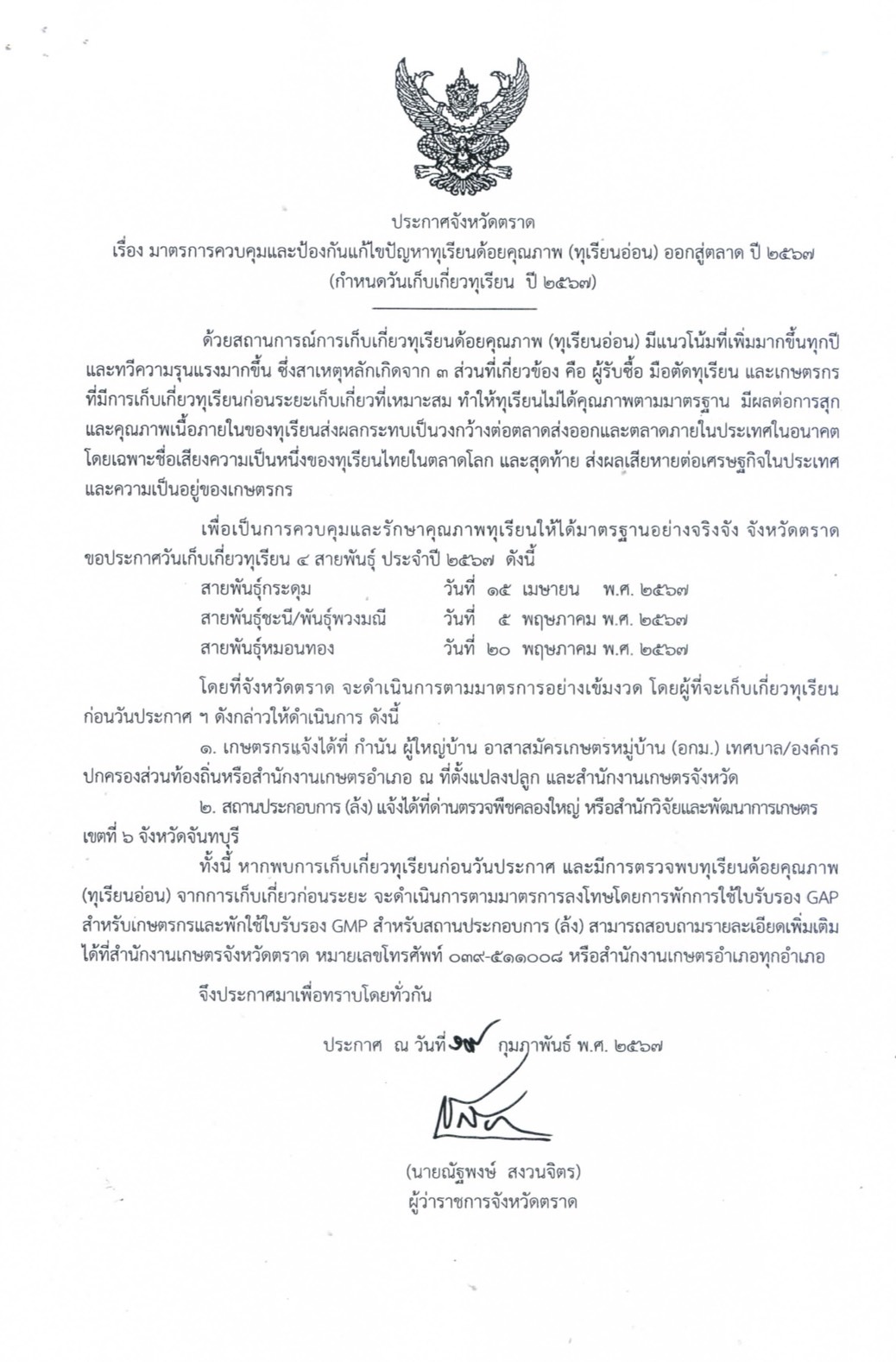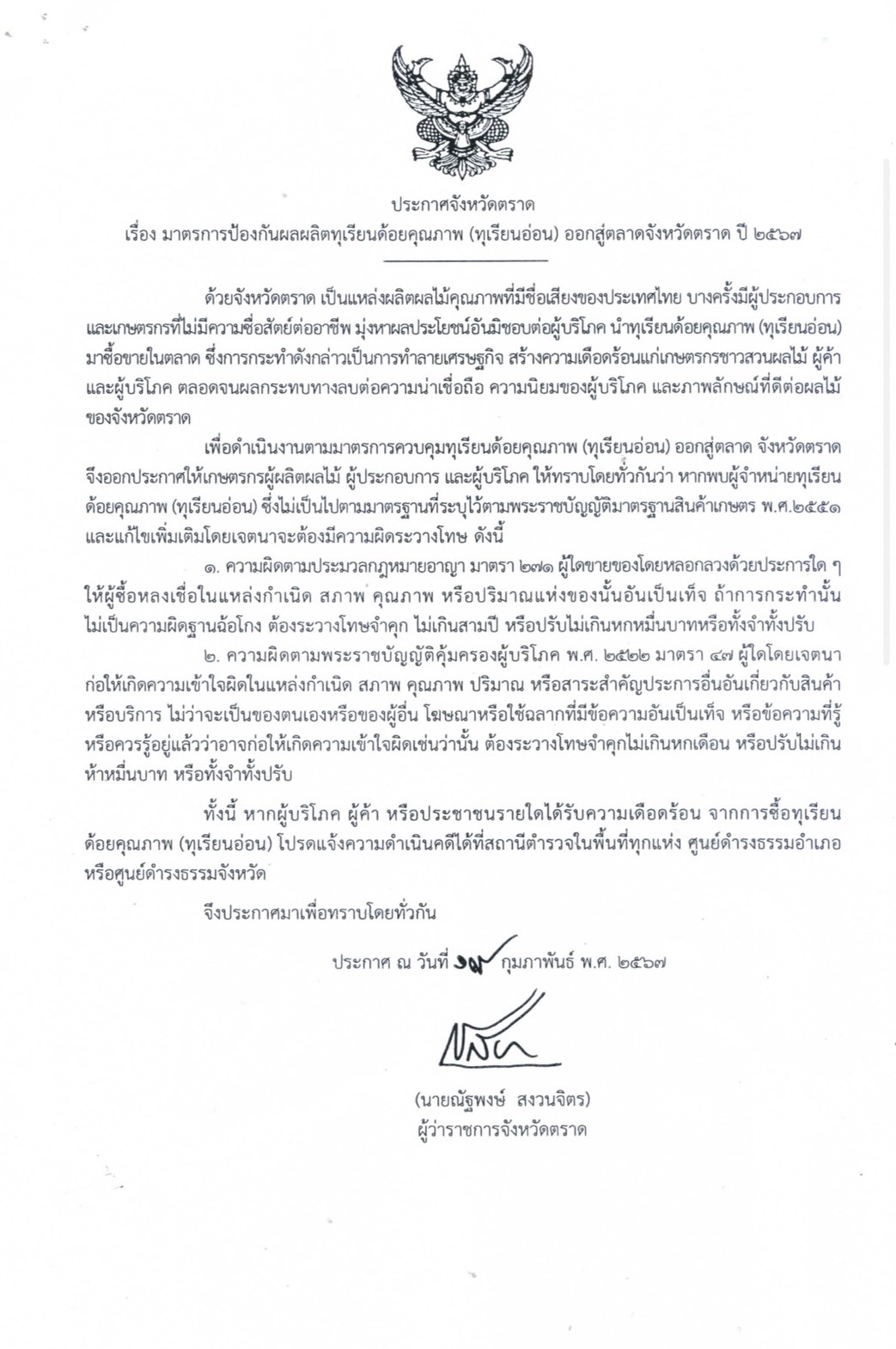 สำนักงานเกษตรจังหวัดตราดขอประชาสัมพันธ์ มาตรการควบคุมและป้องกันแก้ไขปัญหาทุเรียนด้อยคุณภาพ (ทุเรียนอ่อน) ออกสู่ท้องตลาด ปี 2567